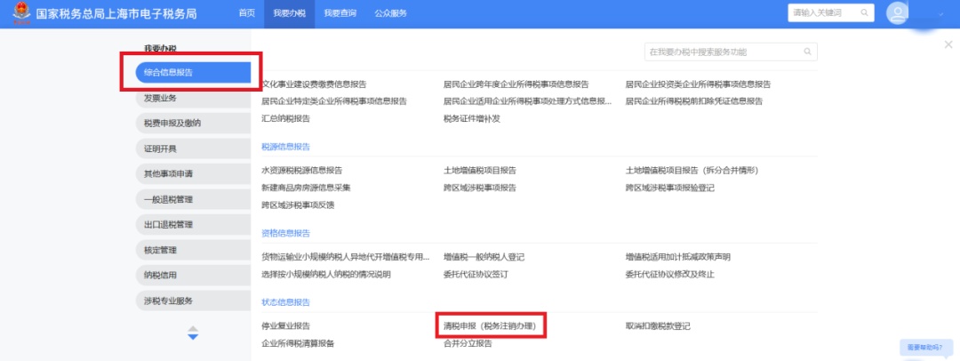 本市分支机构自行登录新电子税局后,依次点击【我要办税】-【综合信息报告】-【状态信息报告】-【清税申报(税务注销办理)】进入。