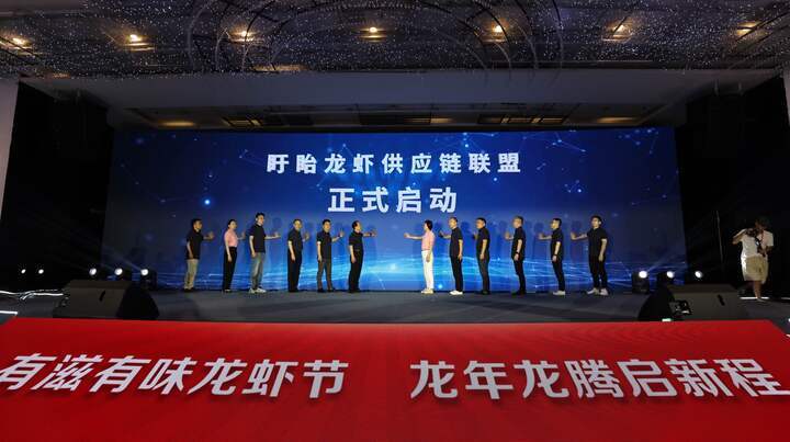 开幕式上,中国品牌建设促进会负责人发布称,“盱眙龙虾”2024年最新品牌强度达到910,连续9年位列全国地理标志产品区域品牌水产类榜首。由中国水产科学研究院淡水渔业研究中心等联合发布的《盱眙龙虾产业发展研究报告》显示,2023年盱眙龙虾总产值306亿元,其中第三产业占比超过一半。发力产品加工,盱眙已打造了2个万吨级加工龙头企业,扶持壮大年产5000吨本土小龙虾精深加工企业5家。全县小龙虾加工能力突破4万吨。