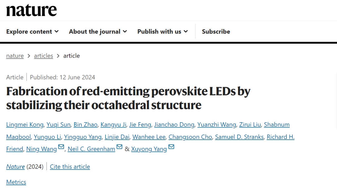 2024年6月12日,上海大学机电工程与自动化学院新显教育部重点实验室杨绪勇教授研究团队与合作单位团队关于“稳定钙钛矿八面体实现高效红光led”最新研究成果,以fabrication of red-emitting perovskite leds by stabilizing their octahedral structure为题在国际顶尖期刊nature上发表。论文链接:https://www.nature.com/articles/s41586-024-07531-9
