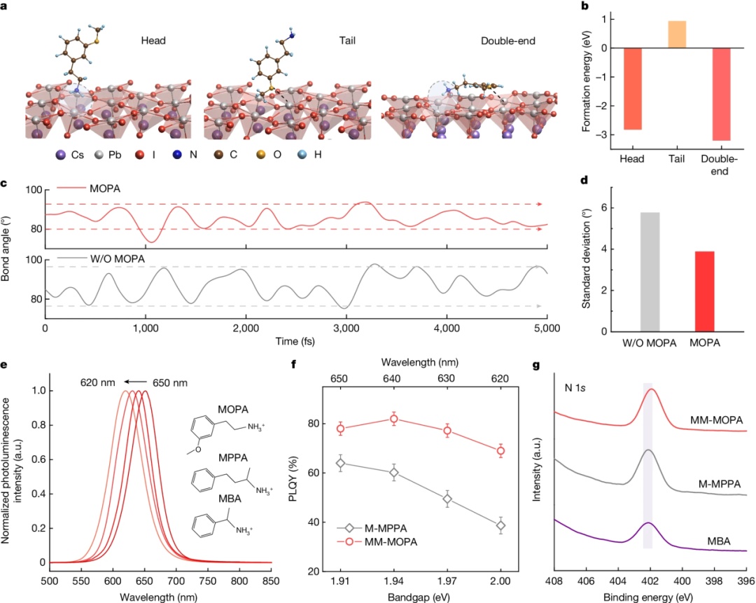 传统的单端吸附型配位分子在调节碘基钙钛矿发射光谱的同时,不可避免地显著降低其荧光量子产率。如何实现高效红光发射而不牺牲钙钛矿的光电性质一直是制约红光钙钛矿led性能的巨大挑战。该研究团队创新性地利用一种独特的双端有机分子配位“锚定”钙钛矿表面以稳定其八面体结构,成功克服了钙钛矿薄膜光谱调节和光电性质之间的相互制约,从而突破了钙钛矿led红光发射的效率瓶颈。得到的led器件在纯红光620-650 nm范围区间内光谱连续可调,其中638 nm发射的led器件外量子效率(eqe)达到28.7%,创造了红光钙钛矿led发光效率的新纪录。此外,器件在高达8 v的偏压下,辐射复合中心几乎不发生分离,表现出极为优异的光谱稳定性。该研究成果将加速钙钛矿led的显示产业化进程。