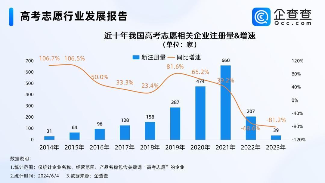 图为近10年我国高考志愿相关企业注册量和增速。图片来源:企查查