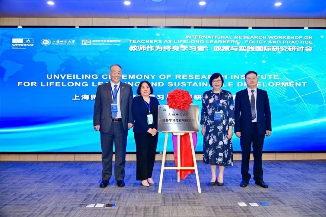 上海市教委副主任刘力,上海师范大学校长袁雯,上海师范大学副校长蒋明军,uil优质学习生态系统团队负责人rakhat zholdoshalieva女士,中国驻联合国教科文组织前任大使/常驻代表杨进共同为“上海师范大学终身学习与发展研究院”揭牌。