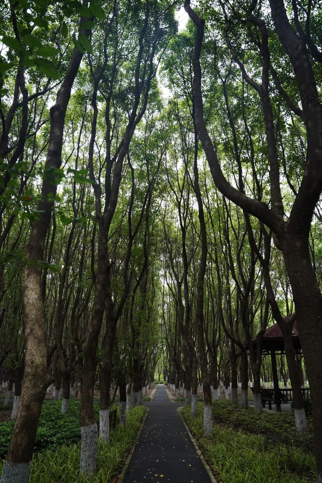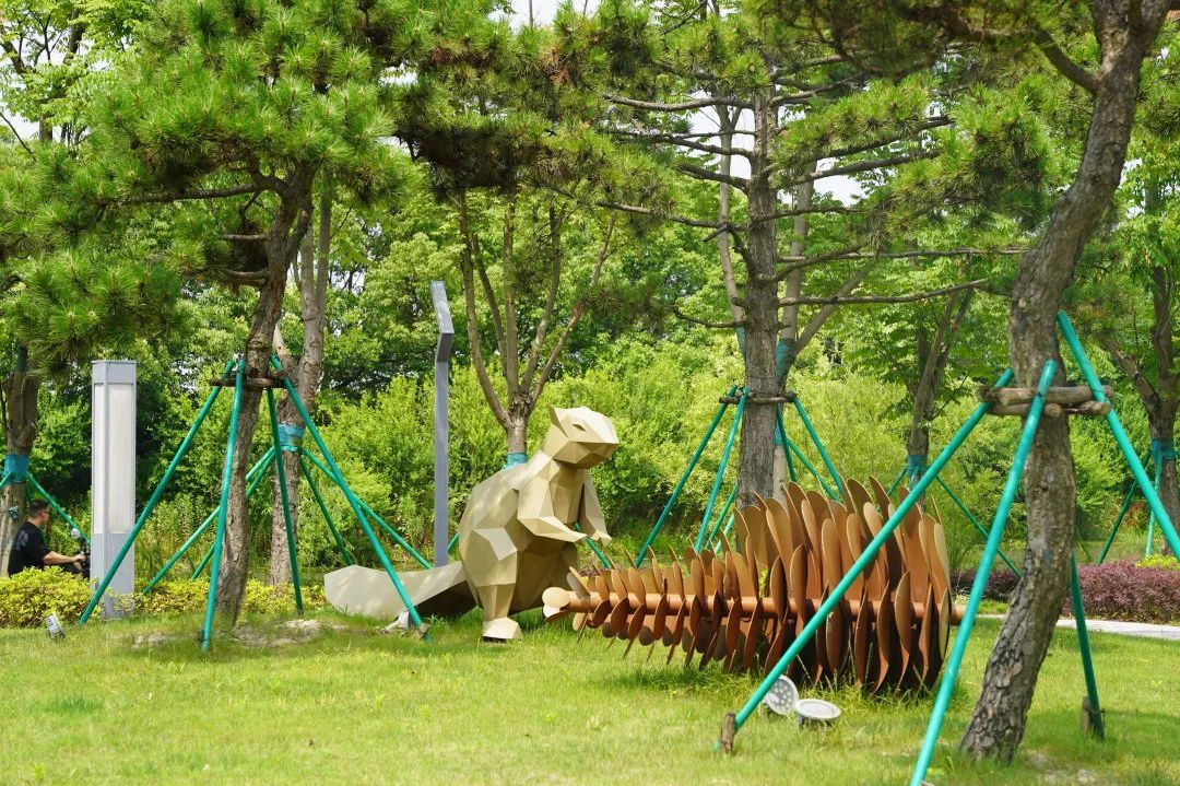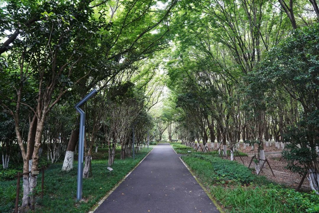 鸟儿空灵的歌声四处传来,沿着石板路往林子深处走,不时可以看到凉亭、座椅、石桌凳、景石、儿童乐园等设施,高大浓密的香樟树林遮挡住了烈日炎炎,让泗沙林地公园变成了绿野仙踪,体感温度也瞬间下降,绝对是夏天的宝藏清凉地。
