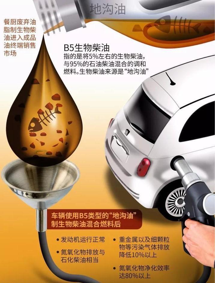 所谓b5生物柴油,就是使用餐饮行业及下水管道废弃的油料(地沟油),通过一系列生化反应后,与普通柴油按5比95的比例,调配而成的绿色能源。