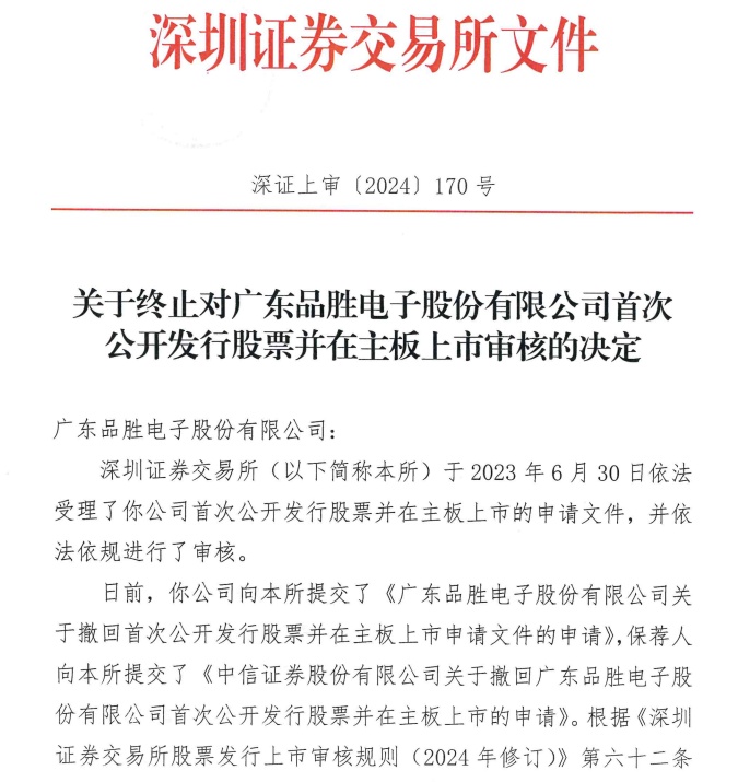 6月25日,深交所发布公告表示,品胜电子撤回了主板首发上市申请,终止了ipo进程,成为安克、绿联和品胜这三大手机充电配件巨头中唯一一个没摸到a股市场大门的品牌。