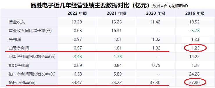 2016年年报是品胜电子在新三板挂牌期间披露的最后一份年报,当期公司实现归母净利润高达1.23亿元,毛利率为37.9%,结果到2022年开始ipo的时候,业绩和盈利能力还不如六年前。