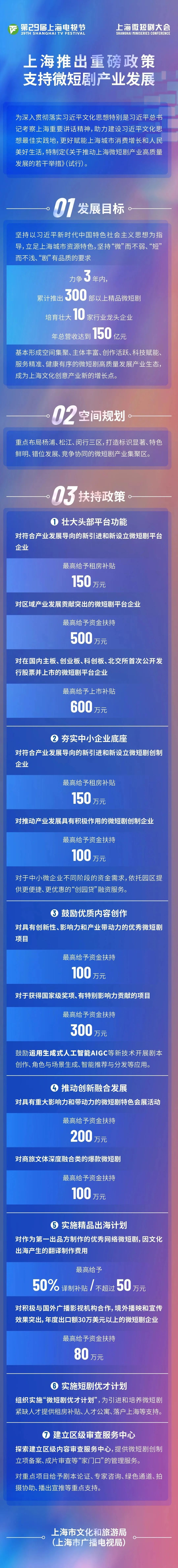 根据新政,上海围绕推动微短剧全产业链经济发展,从培育市场主体、加速产业集聚、精品内容引领、鼓励布局海外、优化审批流程等方面提出9条硬举措,亮出“政策+服务”组合拳。为支持微短剧高质量发展,上海还将每年统筹设立5000万元的微短剧产业引导经费,区级资金将聚焦区域内微短剧产业链企业全生命周期的配套扶持,给予租房补贴、上市补贴、融资服务等;还配套了一揽子扶持计划,“繁花计划”重点支持紧扣时代脉搏、凸显上海特质的项目;“出海计划”鼓励拓展多语种海外市场;“优才计划”抛出租房补贴等支持吸引人才;“保障计划”探索内容审查服务。目标就是要力争在3年内推出300部以上精品微短剧,培育壮大10家行业龙头企业,基本形成空间集聚、主体丰富、创作活跃、科技赋能、服务精准、健康有序的微短剧高质量发展产业生态,成为上海文化创意产业新的增长点。
