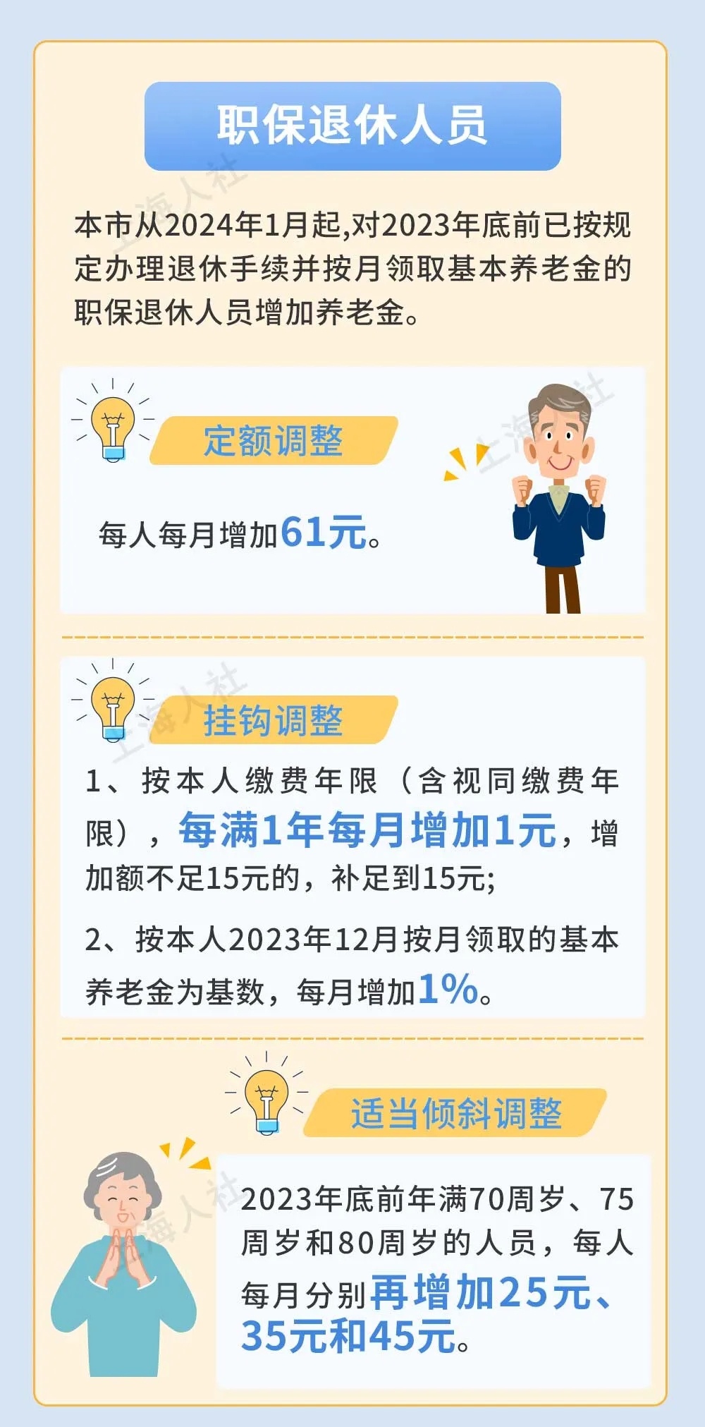 企业和机关事业单位退休人员统一采用定额调整、挂钩调整和适当倾斜调整相结合的办法,具体为:一是每人每月增加61元;二是按本人缴费年限(含视同缴费年限),每满1年每月增加1元,增加额不足15元的,补足到15元;三是按本人2023年12月按月领取的基本养老金为基数,每月增加1%;四是对2023年底前年满70周岁、75周岁和80周岁的人员,每人每月分别再增加25元、35元和45元。