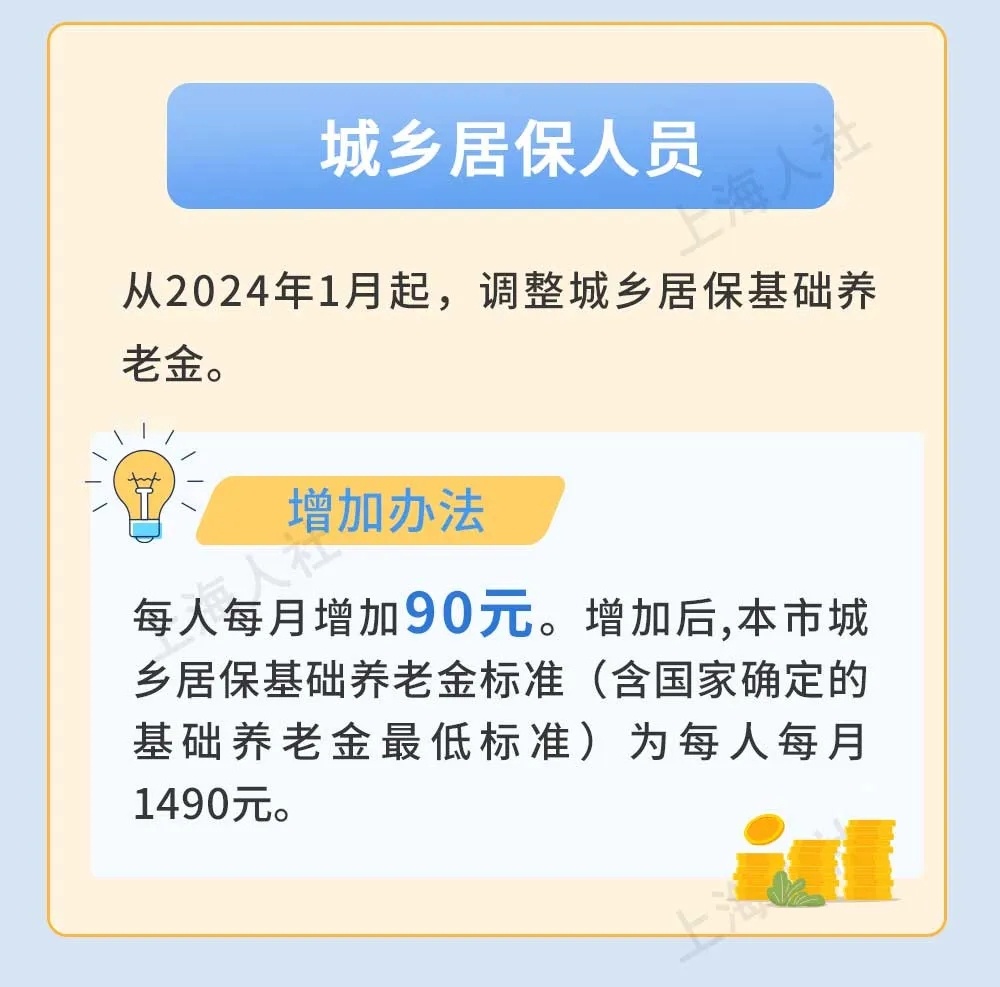 与此同时,本市从2024年1月起,调整城乡居保基础养老金,每人每月增加90元。增加后,本市城乡居保基础养老金标准(含国家确定的基础养老金最低标准)为每人每月1490元。