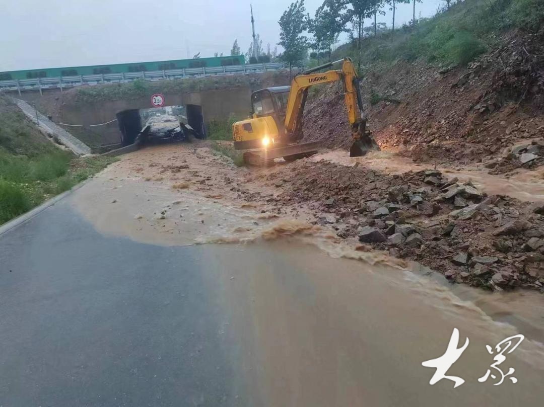 莒南县相沟镇抢险人员在抢险现场开展公路抢通作业。(朱成新 摄)
