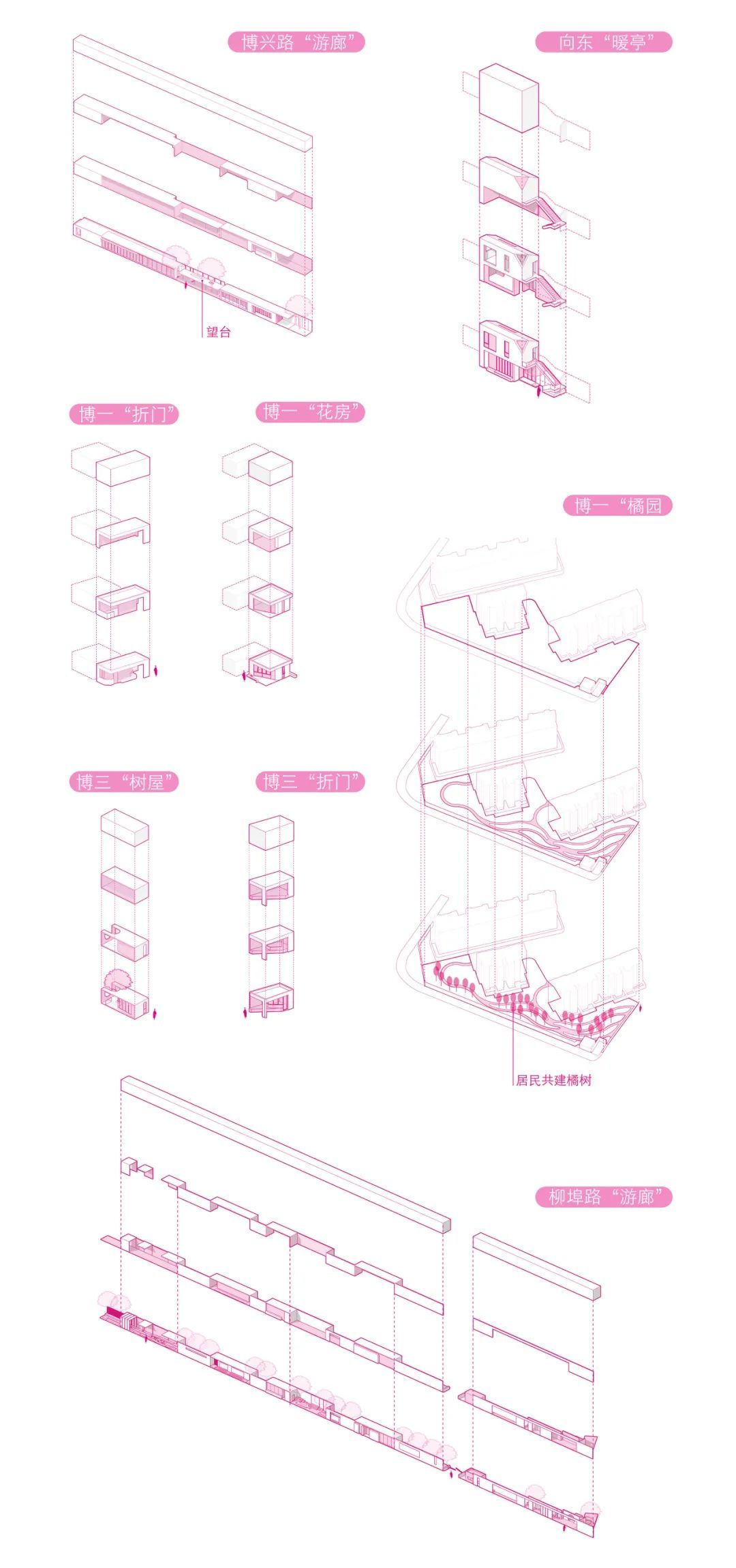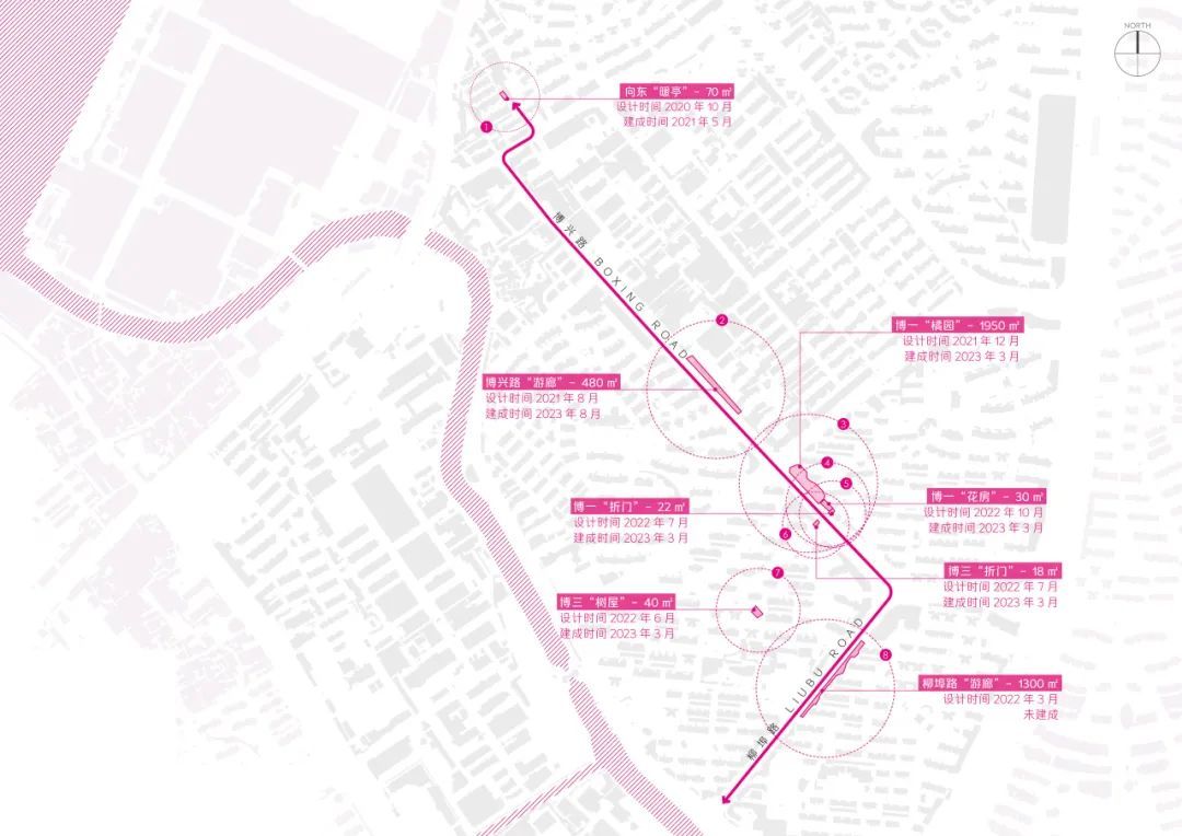 至2023年,设计团队又陆续完成了博兴路游廊、博三树屋、博三折门、博一折门、博一花房、博一橘园、博兴路望台、柳埠路游廊共8处小微空间的设计。由于这些项目源于不同部门的工作项目包、不同年份的工作计划(见 下表),整个更新过程历时缓慢,但同时也为实验式设计提供了更多的实地调研、公众参与、试错纠错的机会。