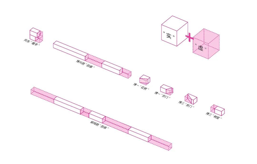 从博兴路、柳埠路沿线现状看,街道空间除了人行道以外,几乎没有更多的公共开放空间。因此,每个更新点位都应该是一个提供社区公共生活的机会。在满足具体功能需求(社区活动室、社区食堂、小区门卫、24小时社区事务受理等功能)的同时,每个点位在空间上的“虚实关系”设立就成为了整个系列更新设计的基础。“实空间”提供公共服务,“虚空间”引导户外交往,在“虚实空间”原型基础上,设计根据具体点位的环境特性、使用功能、活动需求、治理需求等综合分析,通过“并列、叠加、变形”等方法,将“原型”演化为每个具体点位的“空间模式”,从而逐步构建博兴路-柳埠路沿线的公共界面空间秩序。