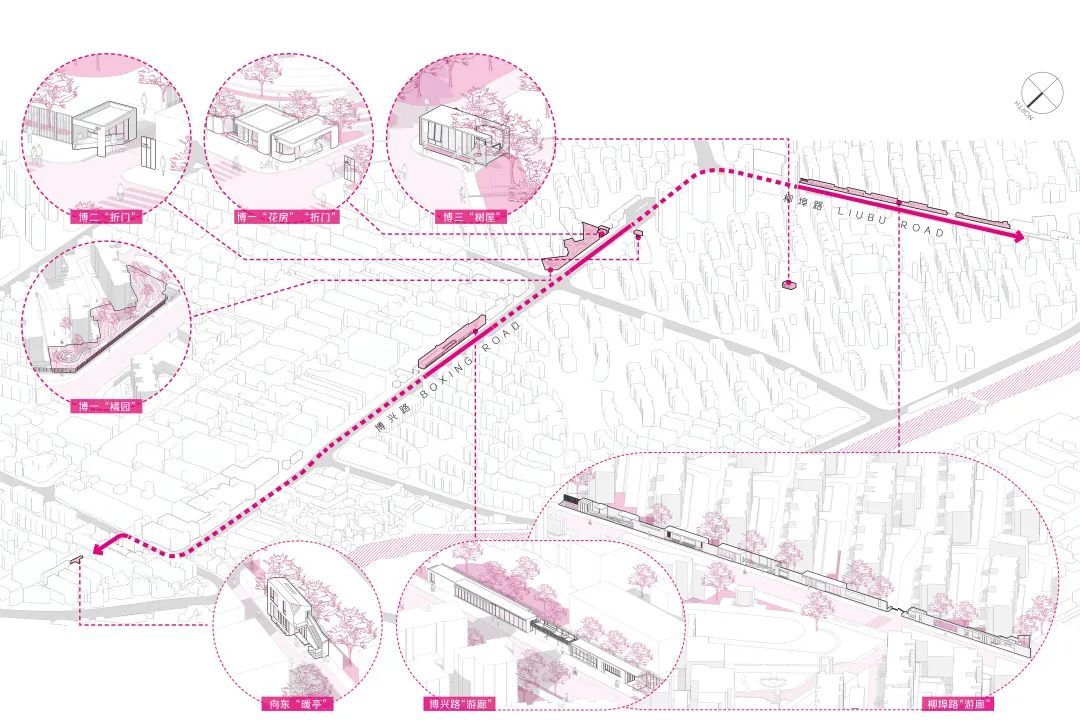 2020-2023年,设计团队在沪东“博兴路-柳埠路”沿线开展渐进式系列更新实验,建立“空间原型设定–空间模式建立–要素特征设定–空间意象转译/环境响应–公共生活有机嵌入”的设计手法,为社区沿街界面的有机更新探索一条自下而上的实践方法和路径。