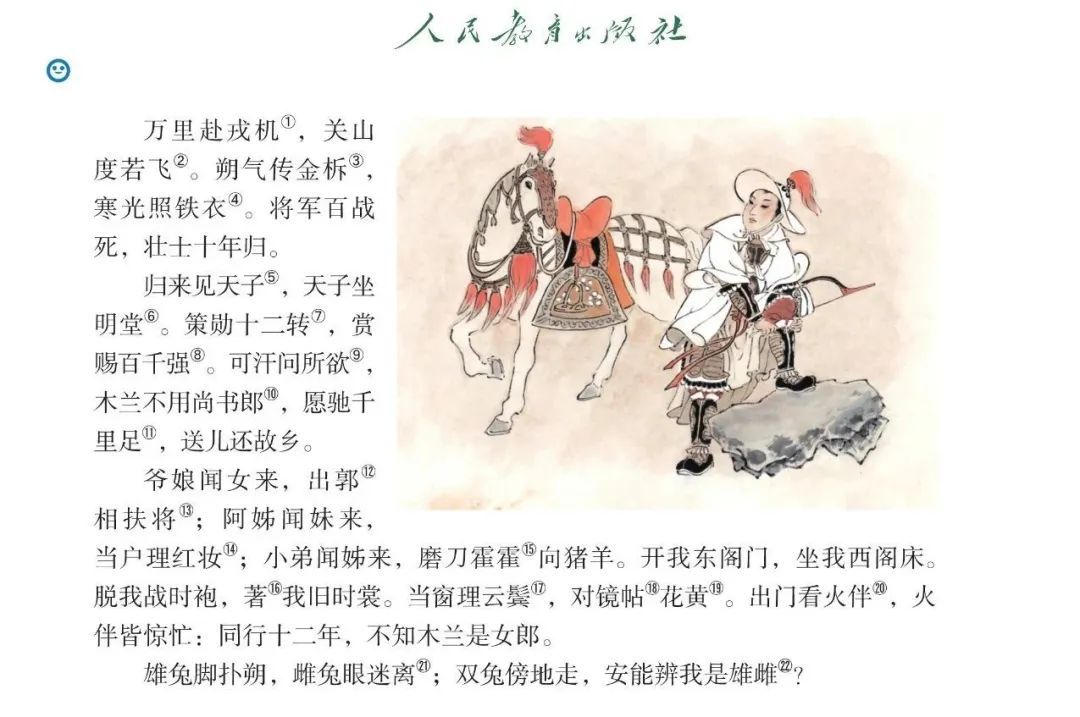 我说:“何以见得呢?”(我常常问学生:何以见得?是何理由?原因何在?)她说:“你想想,同行十二年,不知木兰是女郎,这个行军打仗的其他人都是傻子啊?”于是,大家都起哄了,说这是文人编造出来的。