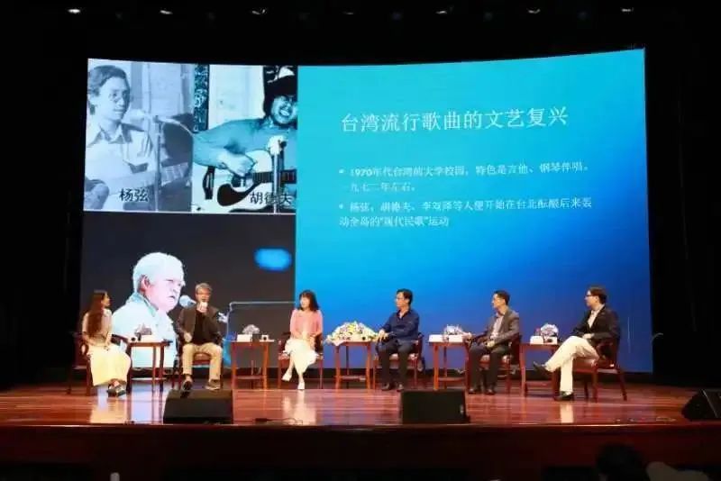 随后,与会嘉宾在轻松愉悦的氛围中,畅谈校园民谣的起源发展、风格演变,从词、曲角度解读校园歌曲中蕴含的古典文化。张香维以早期民谣民歌创作歌手的身份,分享当时参与台湾民歌大赛时的盛况。徐冰带领大家一起回顾了大陆90年代以来校园歌曲的发展历程。周文彬从古典音乐切入,以《橄榄树》歌曲为例,分析了民歌的创作发展历程。唐诗诗从古典文学和新诗角度对校园歌曲创作作了深入浅出的分析,指出两岸音乐同根、同源的脉络。游宜群老师用轻松风趣的方式,介绍了各个时期代表作,并与周文彬联袂演绎二重唱《秋蝉》,歌声婉转悠扬,令现场观众为之沉醉。