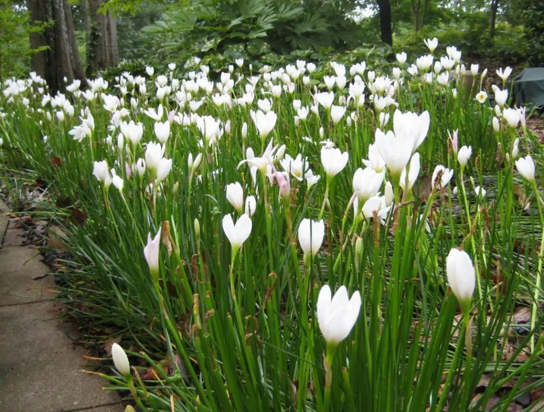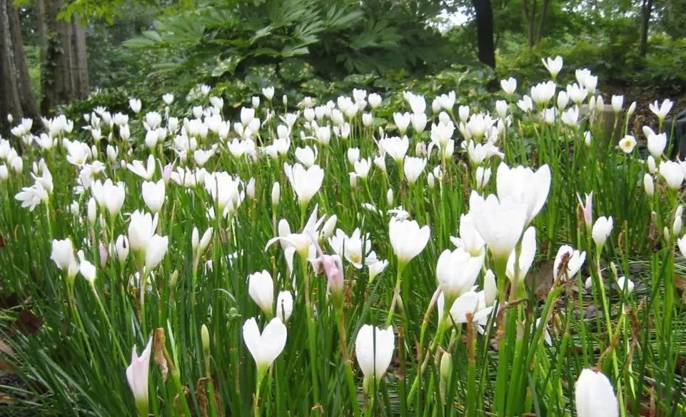 a: 这或与它的原产地环境有关,高热少雨的气候让它的生长对雨水敏感起来。高温干旱时它的球茎就进入短暂的休眠状态以保存水分与能量,雨季一到就抓紧生长和开花赶快繁衍下一代。这种特性让葱莲以及其他风雨兰带上了一种独特的气质,让人期盼着它们的雨后开花,让炎热的夏季有了美丽的期待。