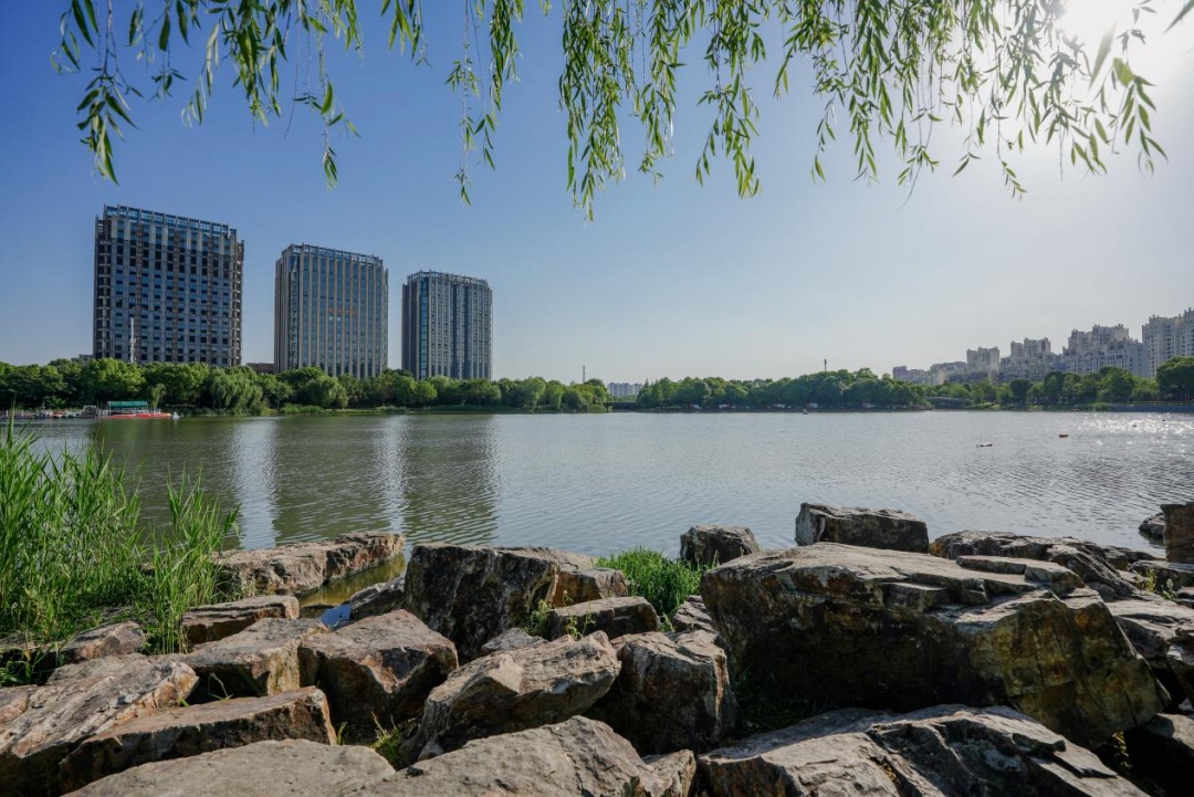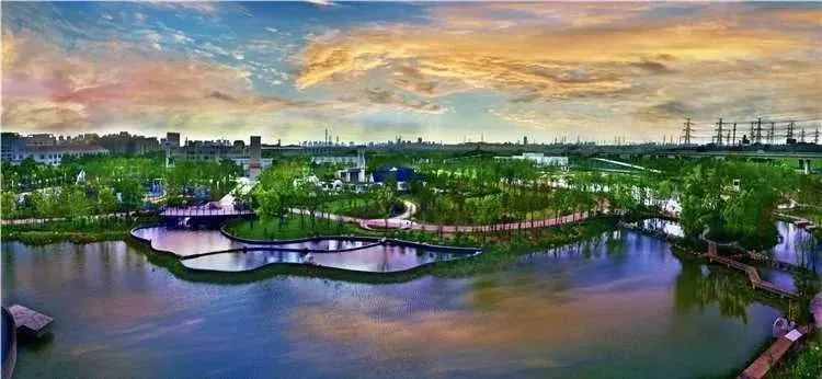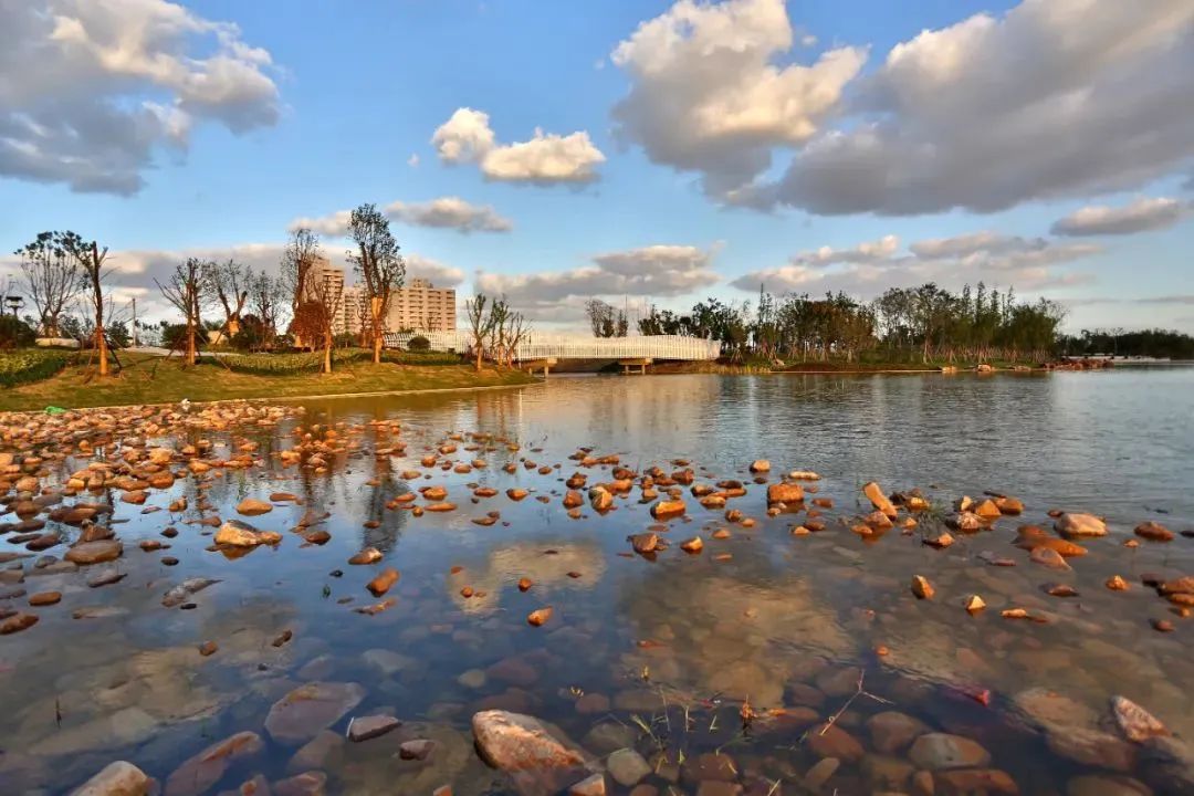 公园核心区以“回”字为主体结构,将“依水依树人相融,绿水相连环环扣”设计理念融入景观打造体系,一条主要游览带贯穿公园各个区域,在其沿线组织出不同的生态景观。湖岸柔和的曲线缓缓延伸入水中,形成了独特的滨水文化。自然的圆石、柔软的草皮、清新的空气……无不创造出城市与自然共融的景观空间。
