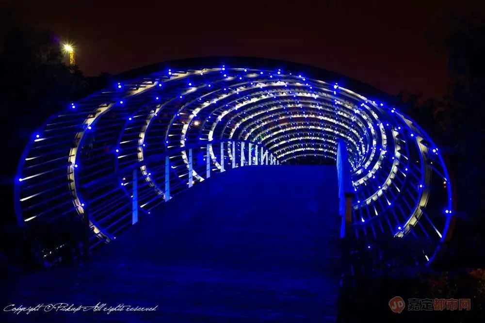 以折曲的钢板栏杆来传达折纸艺术的桥,以“竹里问茶”为设计主题的桥,以枫叶为造型的桥……公园内有五座各具特色的景观桥。当夜幕降临时,在灯光的映衬下,各色的桥就如同一条漂浮在水面上的光带,美不胜收。