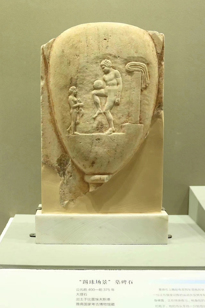 在古希腊人的墓碑上,甚至也能看到运动的画面。展览上展出了一件雅典国家考古博物馆收藏的、出土于比雷埃夫斯港的“踢球场景”墓碑石。石上雕刻有双耳长颈瓶形状,瓶身上雕刻着一位正在接受训练的运动员及其年轻侍从。运动员全身裸露,身材健美,正在踢球练习。他身后的柱子上叠放着他的袍子,他的侍从手持一只短颈球形破瓶和刮汗器,注视着主人的训练过程。