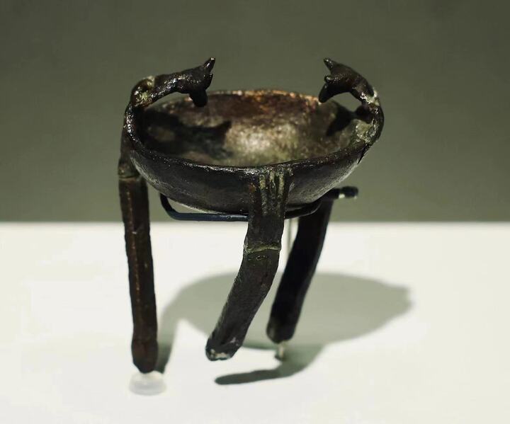 管琳告诉记者,这件三足鼎出土于奥林匹亚考古遗址菲迪亚斯工作室西北,由奥林匹亚考古博物馆藏。在古希腊的几何风格时期,三足鼎被视为崇高的祭器。此类型鼎设计有三个支脚,鼎缘配置两个把手,把手以人形或兽形的小雕像进行装饰。据《荷马史诗》记载,阿凯亚的英雄们在围攻特洛伊的战役中,曾将三足鼎作为体育竞技的优胜奖品。