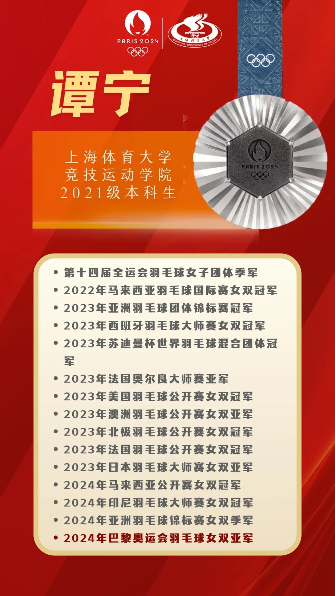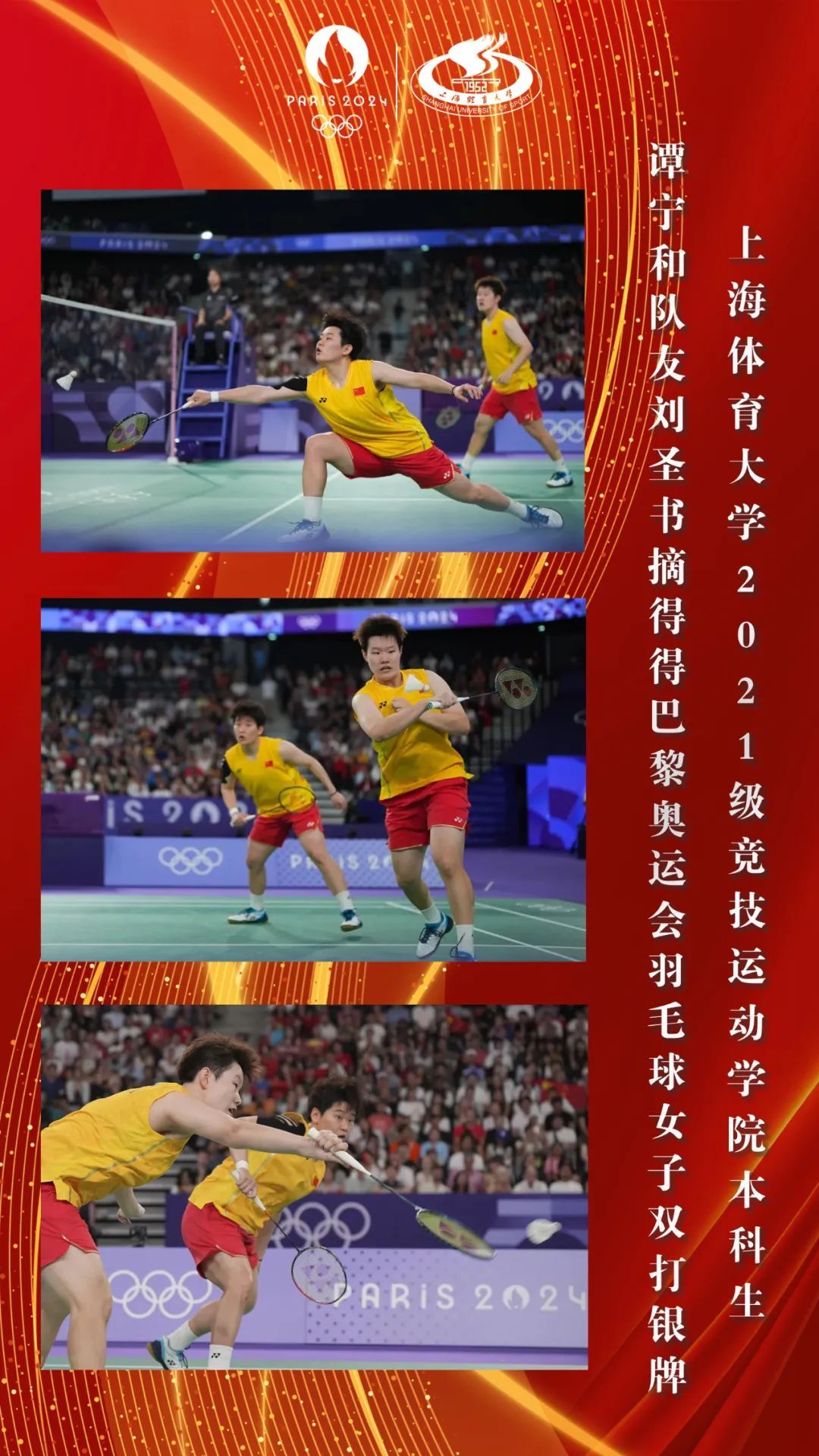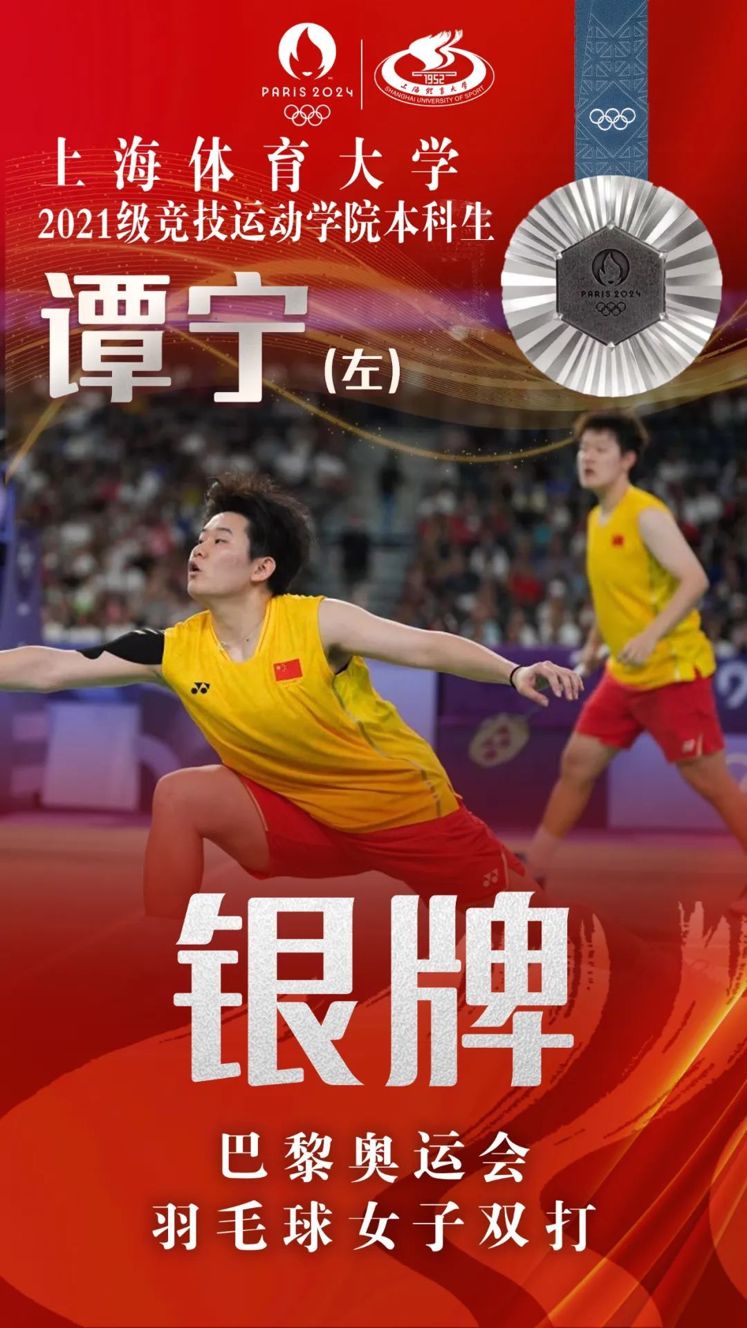 8月3日,在巴黎奥运会羽毛球女子双打决赛中,中国羽毛球队组合、上海体育大学竞技运动学院2021级本科生谭宁和搭档刘圣书获得银牌!这对组合首次参加奥运会便打进决赛,同时也帮助中国羽毛球女双继2004年雅典奥运会之后再一次包揽冠亚军。