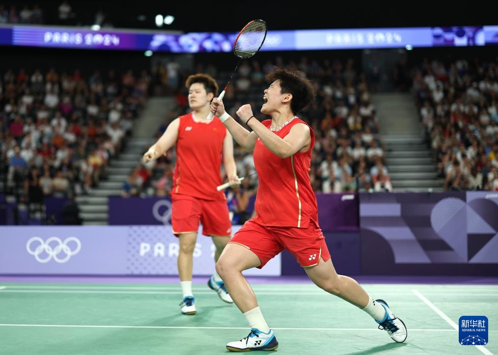 8月2日,中国组合刘圣书/谭宁(前)在比赛中庆祝得分。新华社记者 贾浩成 摄