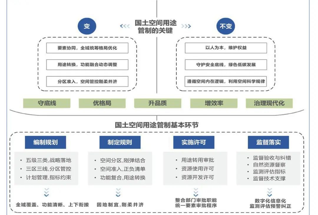 一是编制规划,构建全域覆盖、功能清晰、上下衔接的规划分区体系。国土空间规划是国土空间用途管制的核心依据,关键在于落实国家主体功能区战略,构建功能清晰的规划分区体系。各层级规划各有侧重、上下衔接,顶层的规划分区突出主体功能的划分,对开发强度、空间布局进行整体调控,到中观和微观逐步转化为更为丰富的功能分区,最终将上位规划确定的分区管控要求落实到地块,为规划许可提供依据。