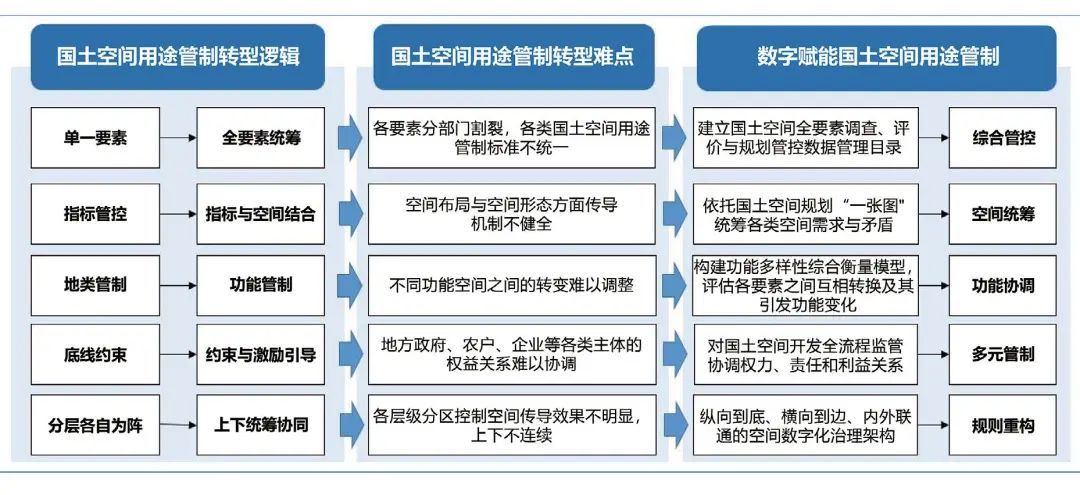 第三阶段(2018年至今):探索全域全要素统一管制。2018年,国家部署建立统一的国土空间用途管制制度,推进全域全要素协同治理,建立动态高效的监管体系和信息共享机制。资源调查、管理、规划、利用等全流程信息化水平进一步提升,自然资源“一张网”、 “一张图”和国土空间基础信息平台建设为国土空间用途管制提供技术支持,但仍面临网络和算力设施承载力不足、数据治理能力有待提升、智能化水平不高等问题,需要充分运用数字技术赋能,推动其从“数字化”向“数治化”转型。
