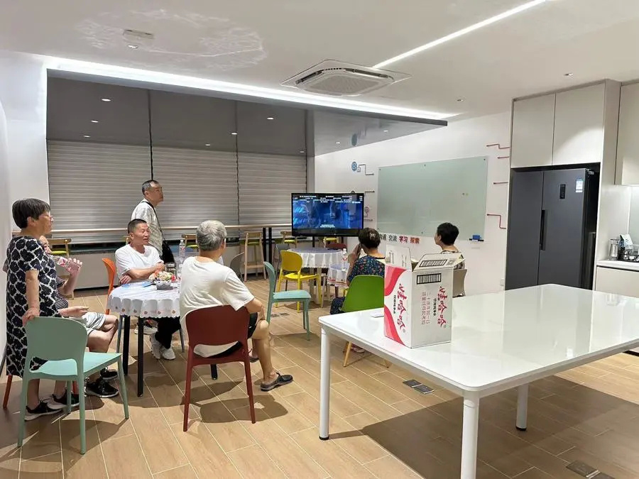 当天晚上,位于该居民区的石化街道第六睦邻中心灯火通明,开着空调的室内凉爽舒适,几十名居民正在这里休憩纳凉。停电后,76岁的许长生和老伴选择来这里避暑,此时电视里正播放巴黎奥运会中国队比赛,他们俩情不自禁地为中国队叫好助威。