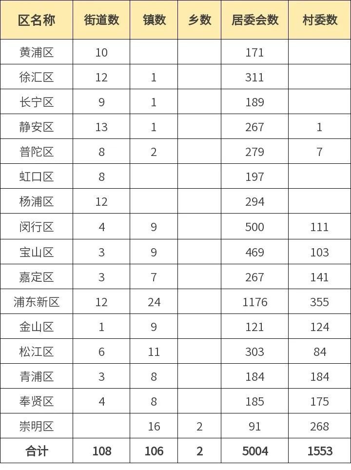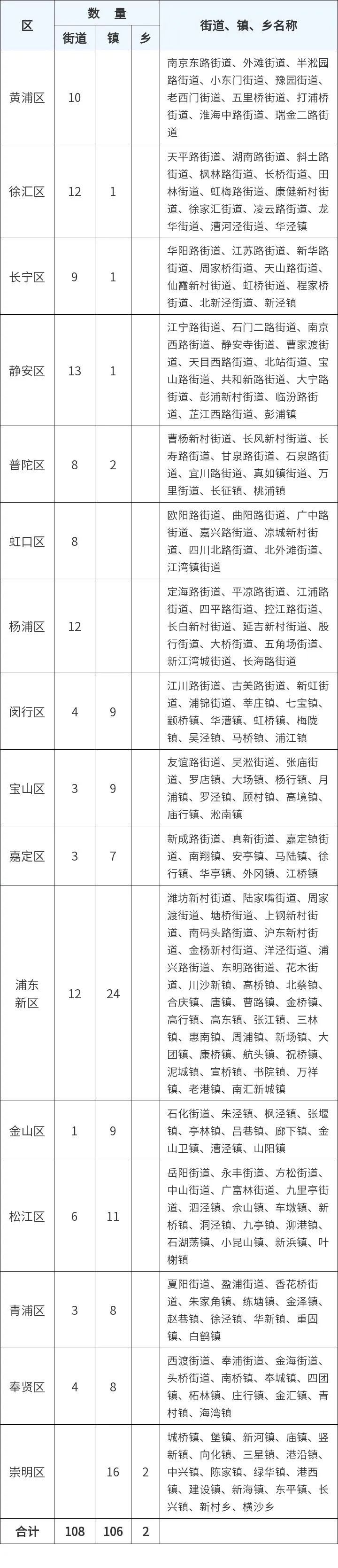 你知道上海现在有多少街道多少乡镇吗?市民政局公布最新上海行政区划名称表:截至2024年7月31日,全市16个区共有108个街道、106个镇、2个乡。所有街道、镇、乡名称详见↓