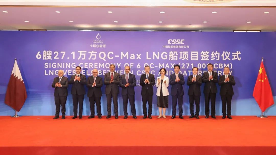 9月9日,公司与卡塔尔能源液化天然气公司,在上海签订6艘全球最大27.1万立方米超大型lng运输船建造订单。卡塔尔能源事务国务大臣、卡塔尔能源总裁兼首席执行官萨阿德·谢里达·阿尔卡比,卡塔尔能源液化天然气首席执行官卡利德·阿尔塞尼,上海市副市长陈杰,上海市政府副秘书长庄木弟,上海市崇明区区委副书记、区长李峻,上海市经济和信息化委员会副主任戎之勤,长兴岛管委会党组副书记、执行副主任吴召忠,中国船舶集团总会计师贾海英,中国船舶工业贸易有限公司总经理胡凯,公司董事长陈建良、总经理翁红兵等嘉宾出席签约仪式。