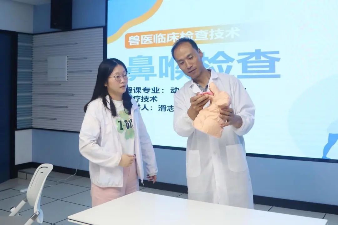因此,滑志民带领团队专门开发了一系列动物医学诊疗教学模型,在全国率先建设成动物医学临床技能模型训练实训室,并先后开发了数字解剖动物实训系统等,建设了全国首个动物医学虚拟仿真实训中心。同学们先在仿真动物模型实操中强化临床技能,再到实体动物医院临床实践中塑造职业能力。“现在形成了‘虚拟系统实训、仿真模型实操、动物医院实践’三阶递进的实训教学体系,确保同学们实践技能得到充分训练。”