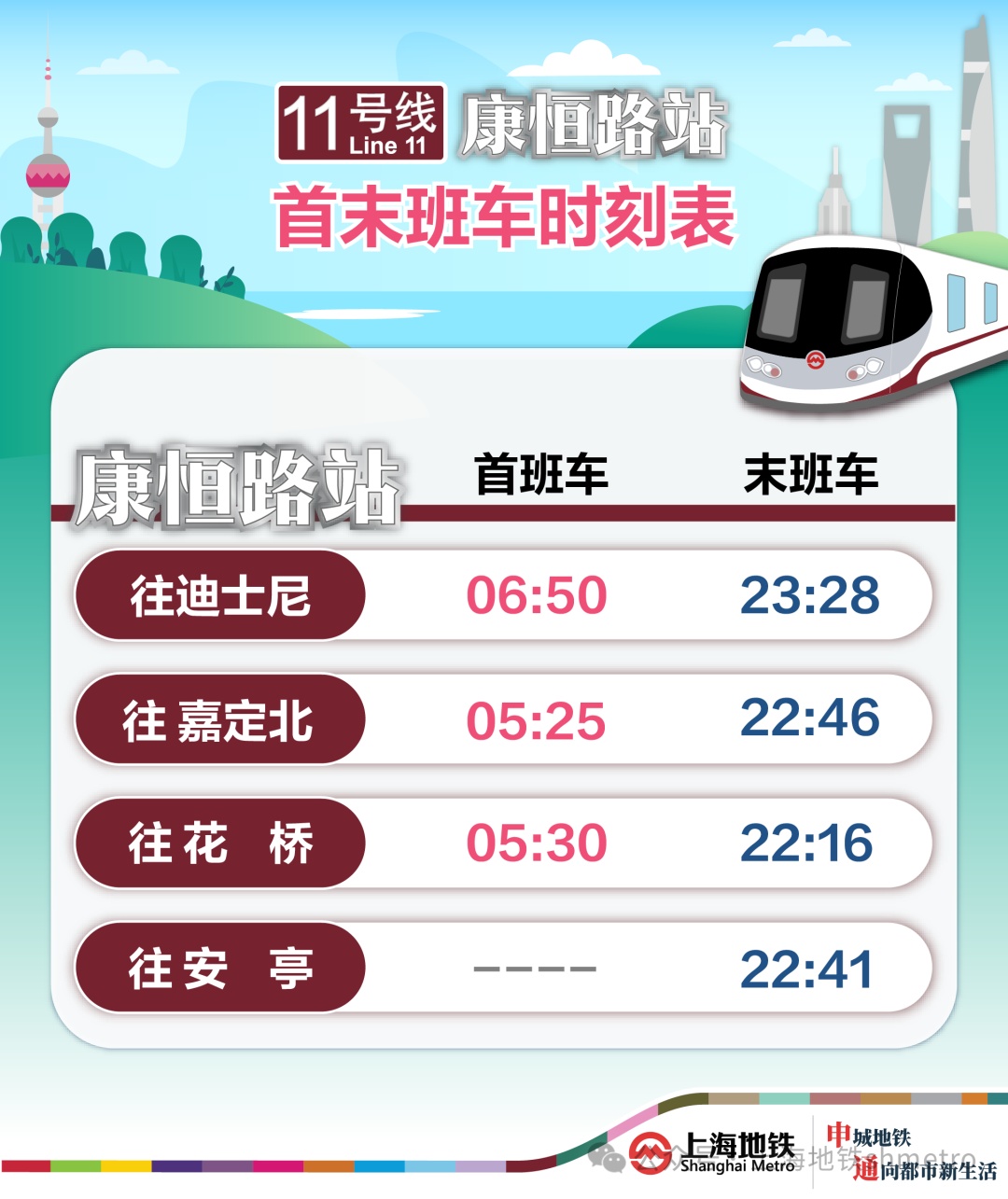 11号线康恒路站开通后,往迪士尼站首班车时间06:50、末班车时间23:28;往嘉定北站首班车时间05:25、末班车时间22:46;往花桥站首班车时间05:30、末班车时间22:16,往安亭站末班车时间22:41。列车运行间隔与既有运营方案一致,该站工作日早晚高峰时段平均2分30秒~3分45秒,工作日平峰时段6分钟左右;节假日高峰时段(7:00~20:00)平均5分钟;其余时段5~8分钟。