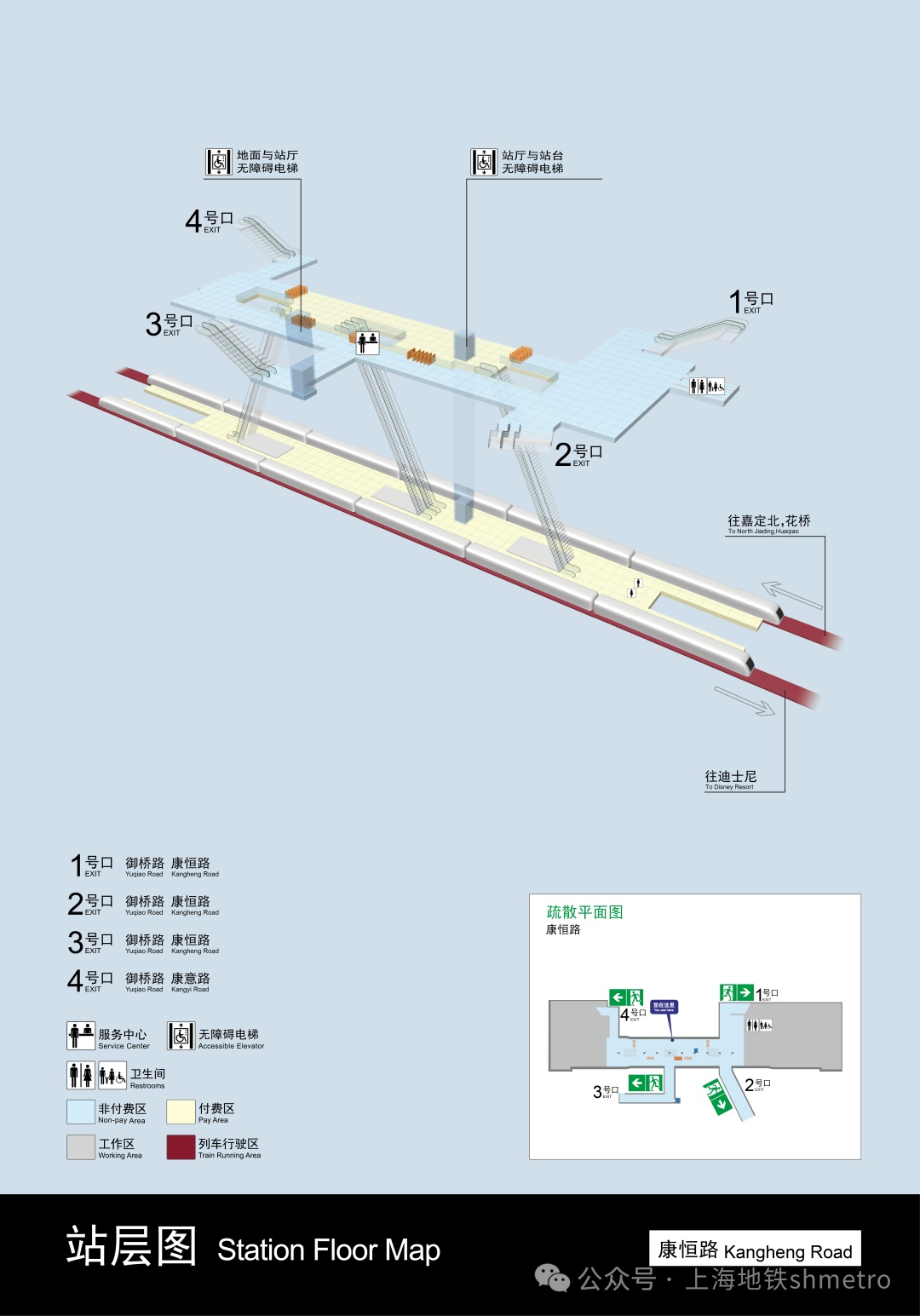出入口直通地块楼宇,通勤“一步之遥”。 康恒路站共有四个出入口,除了可正常出入地面外,均与地面办公楼宇地块进行了连通。上海地铁充分考虑地块出入口的结建需求,积极推进地下联通通道与车站建设施工同步实施,最终实现了四个出入口均可通过结建通道直接进入地面楼宇或园区区域(2号口为下沉式广场)的通行功能,为周边市民乘客的出行提供便利。