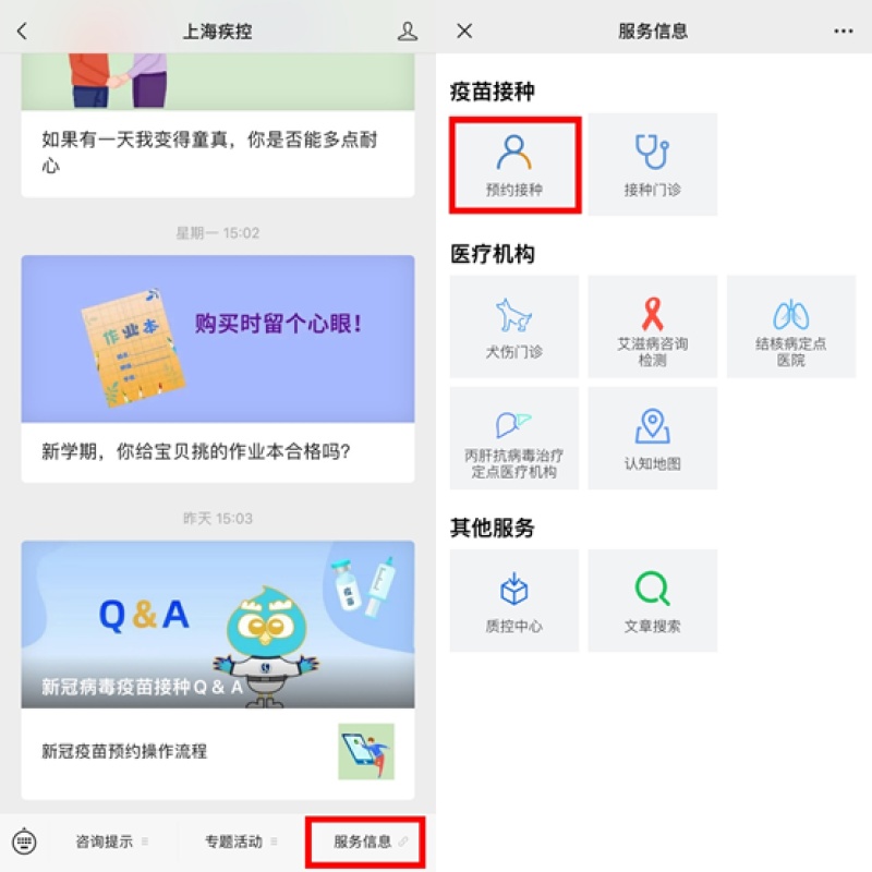 途径三(3)通过“上海疾控”公众号→“服务信息”→“预约接种”进入“智慧接种”。