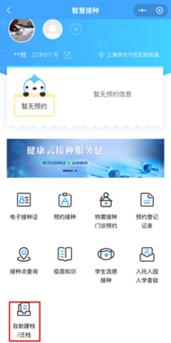 (2)修改预约地点:如果要修改接种地点,则点击“智慧接种”页面下方的“自助建档/迁档”按钮,即可进入申请页面,修改个人居住信息,选择接种门诊并上传居住证明(特需接种门诊不需要),等审核通过即可预约流感疫苗(如果大数据库中自动校验通过,可即时完成自动建档和审核)。