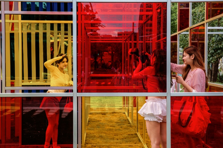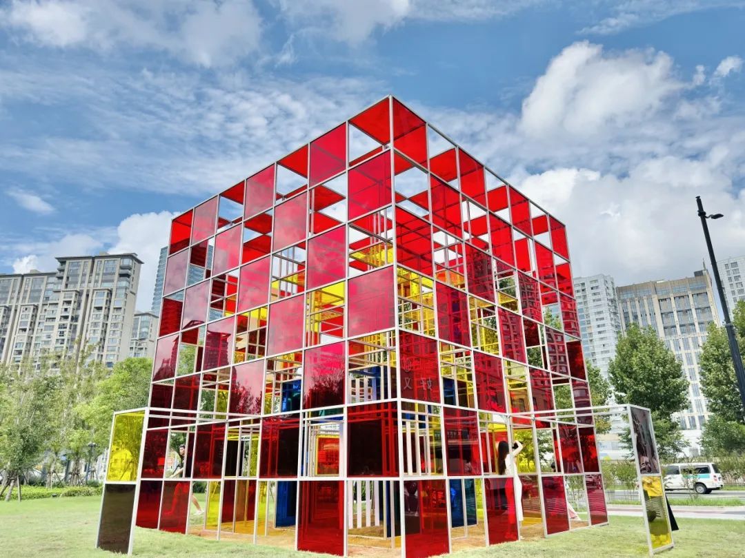 该作品由三层彩色亚克力组成,由大到小层层嵌套,每一层都呈现出明快而富有活力的色彩空间,红、黄、蓝三原色在不同角度下相互叠映,展现出丰富的视觉效果。观众可以自由漫步其中,感受光影的变化。