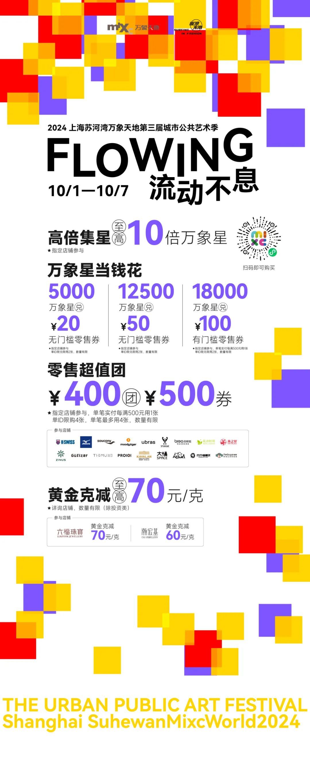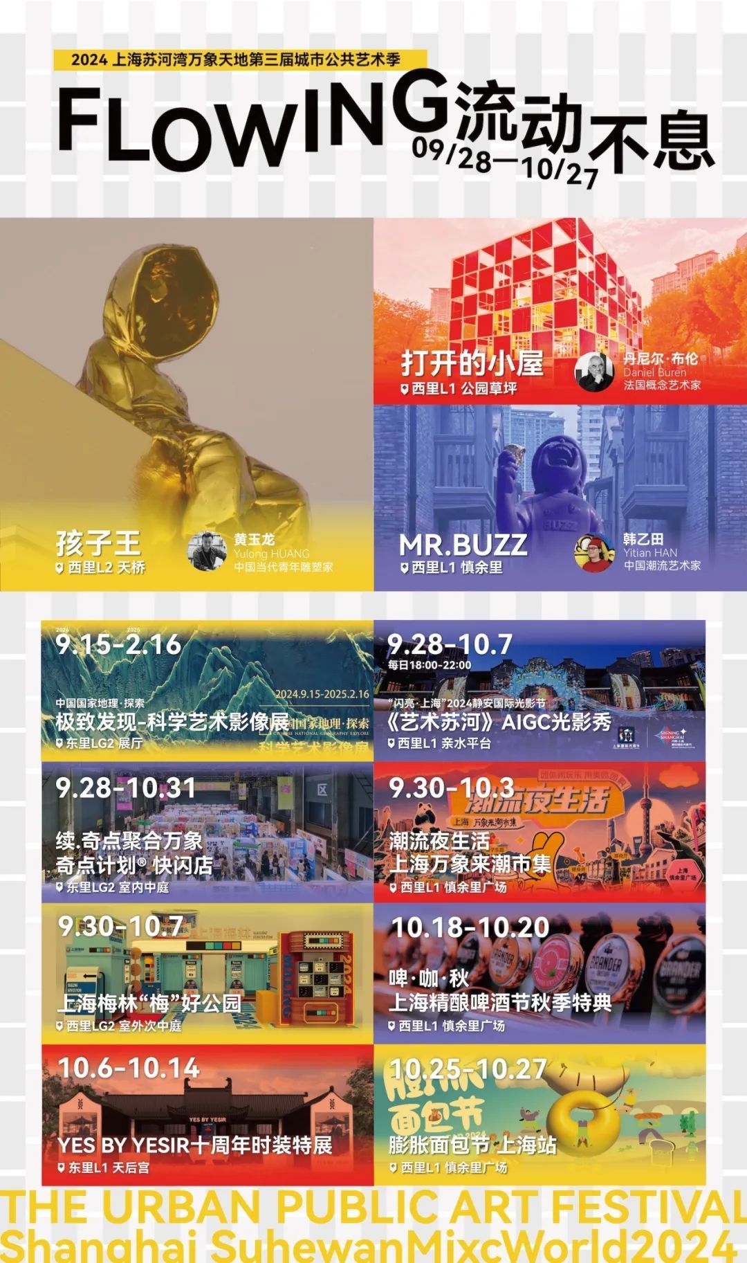 9月28日至10月27日,上海苏河湾万象天地城市公共艺术季第三季向公众开放,以“flowing流动不息”为主题,邀请10余位海内外艺术家共聚,带来《打开的小屋》《孩子王》《mr.buzz》三件巨型艺术雕塑。同期,《艺术苏河》aigc光影秀、奇点计划快闪店、“中国国家地理·探索极致”科学艺术影像展上海首展、美团潮流夜生活市集、“啤·咖·秋”上海精酿啤酒节秋季特典、膨胀面包节上海站也将陆续开启。