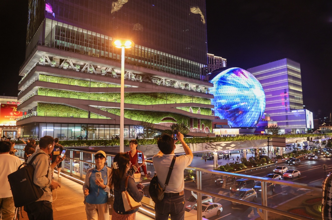 在徐家汇商圈,楼宇上多个大屏联动,带来美轮美奂的灯光联动秀,美罗城过街天桥上汇聚了许多游客,其中有不少人是专为拍照打卡而来。