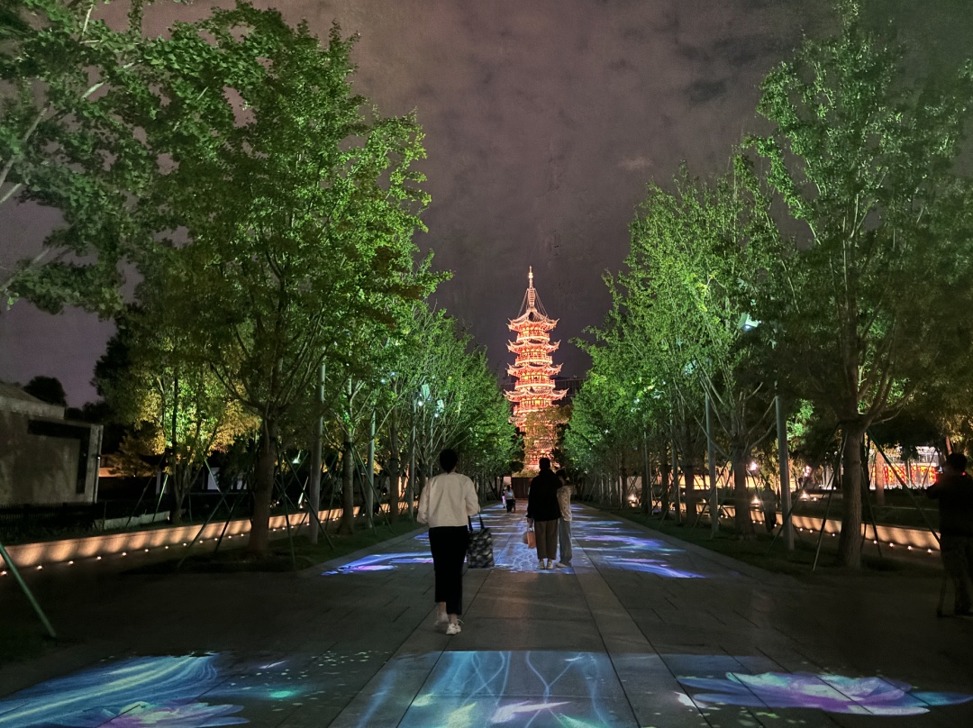 在龙华历史文化风貌区内,银杏大道上的主题投影秀也吸引了不少游客。主题投影秀一共四组灯光效果轮回切换,有“一路生花”“好运锦鲤”“柿柿如意”“向光而行”……每一组光影都是美好的祝福和期盼。
