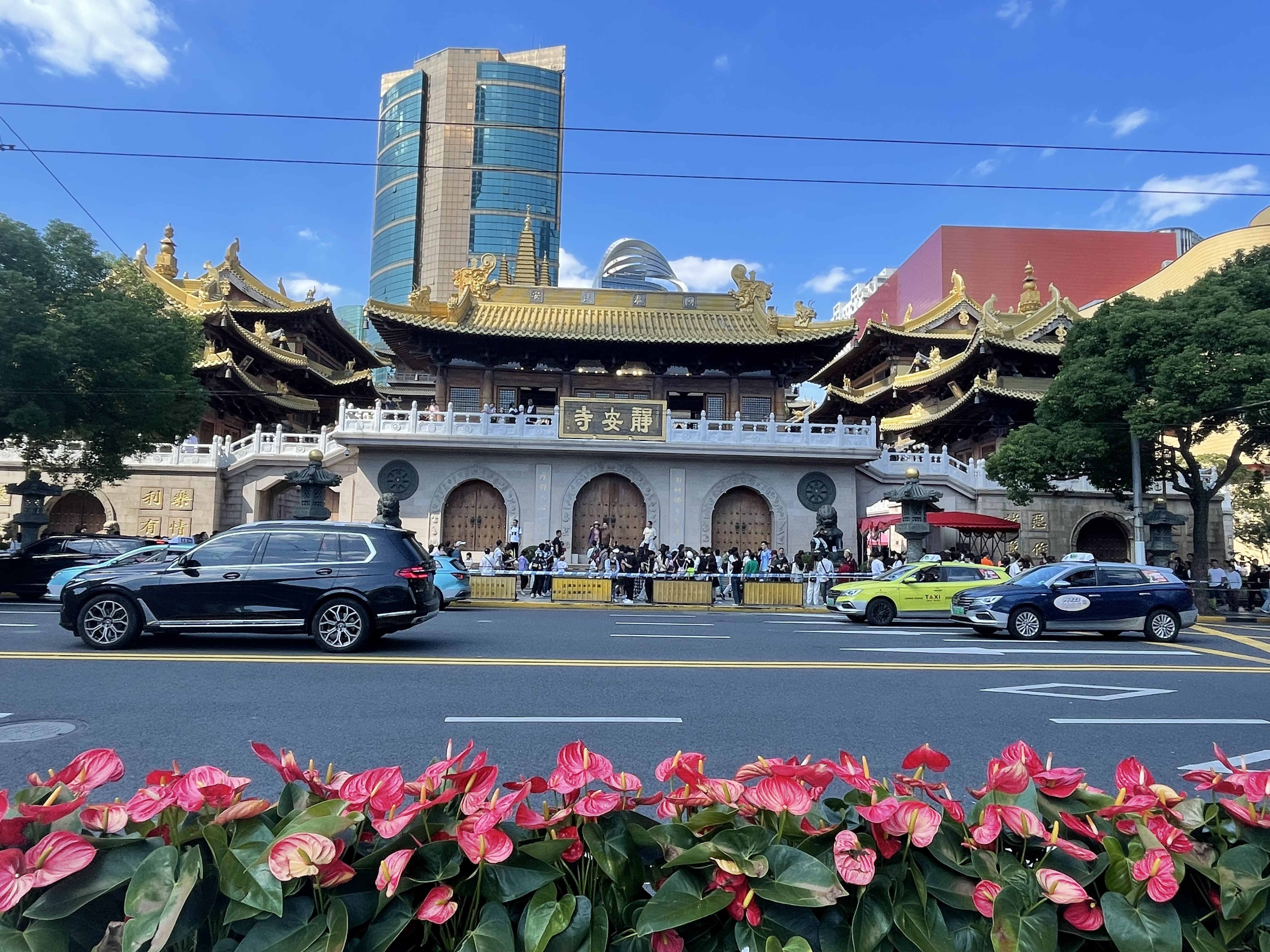 静安寺香烟缭绕,游客们排起长队等待检票进入。