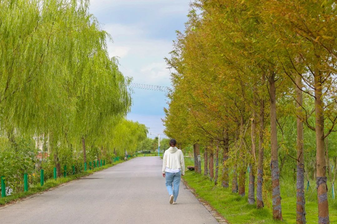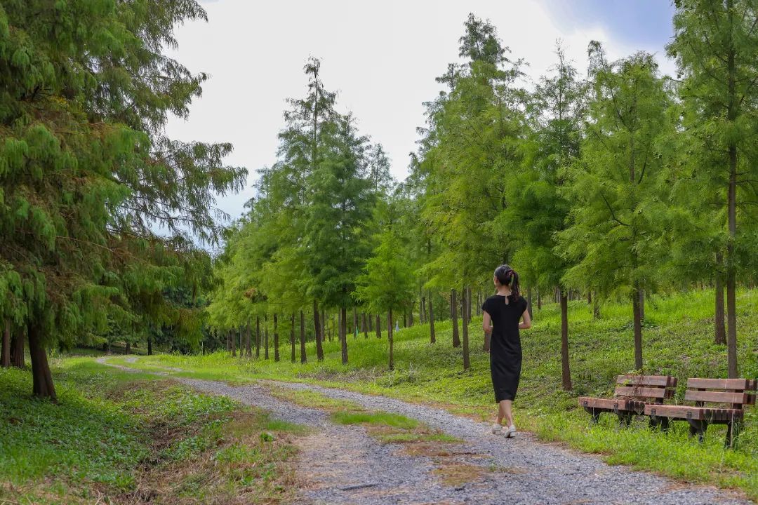 松南郊野公园位于黄浦江上游、车墩镇南部,紧邻松江新城和大型居住社区,园内包括以滨江森林休闲、米市渡文化游览、农渔采摘乡村体验为主要功能的综合活动区,辅以文化展览、采摘垂钓、观光漫步等功能的综合郊野游憩区。宽阔的自然林中点缀着零星的长椅,保持着自然原始风貌,公园道路旁的水杉笔直挺拔,叶子轻柔飘逸如羽毛,在公园入口处的咖啡馆,是遛娃、露营、取景的好去处。林水相依、林田相间、林村相融,秋初的松南郊野公园正是一派好风景,趁着假期,不妨来这体验一次户外郊游吧。