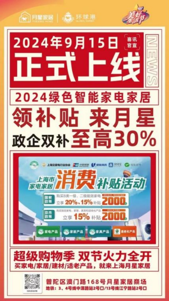 位于上海市普陀区澳门路168号的月星家居,也是首批参加2024上海绿色智能家电家居补贴政策单位之一,自9月15日起,消费者可以来月星家居参与家电家居消费补贴,家电家居家装适老化等四大类44个小类产品,最高可以享受2.2万元的补贴,力度非常大,体验也非常方便。2024年10月1日至7日,在新一轮以旧换新补贴政策的拉动下,澳门路月星家居商场整体销售突破2000万元,同比去年增长75%,其中电器同比增长近200%,销售1000万元。