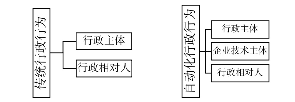 如前所述,理论界对于人工智能的法律主体地位争议较大。在立法界定前,学界也尚未达成共识,甚至在学术界对该问题的研究呈现“泡沫化”倾向。在自动化行政中,打破了以往传统的“行政主体-行政相对人”在行政执法活动中的双方当事人的地位,外部技术企业的介入使行政执法活动中的主体数量增多,多元化主体阻碍了责任主体的认定。自动化行政执法所需要的人工智能系统的设计、安装、运行等方面均需要高新技术企业的介入,这些企业的介入使得传统的二元主体转型为多元主体(见图3)。而多元主体模式势必导致责任主体的认定变得模糊。