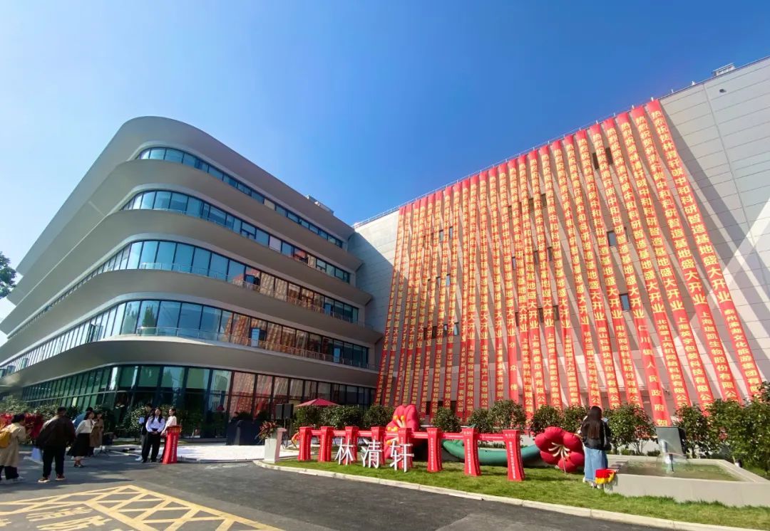 金狮报喜、政商云集,在新桥镇新庙三路1177号,林清轩碳中和科研智造基地启用仪式隆重进行。富有艺术感的雕塑、靓丽的概念店,林清轩创始人孙来春带领大家来到主楼一楼展厅,讲述林清轩的品牌故事和创业历程。“新基地占地近30亩,主要有3大板块,分别为研发楼、智能化生产中心和物流中心,另外一个板块就是眼前的艺术空间。”孙来春介绍,而离这里800米的老工厂已走过了12年,建筑面积只有5000平方米,产能已不能满足发展需求,之前一部分产能只能转移到周边配套生产,新基地投用后产能都回到松江,部门间交流更方便,也能更加有效保障产能和品质。