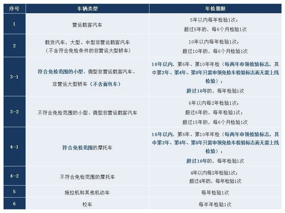 9座(包含9座)以下的非营运小微型载客汽车、非营运大型轿车、摩托车(面包车除外),10年内每两年申领检验合格标志,其中第2年、第4年、第8年只需通过“交管12123”app在线申领免检车检验标志而无需上线检验;第6年、第10年需进行上线检验。10年以后每年上线检验1次。年检可在车辆检验有效期满前三个月内申请办理。
