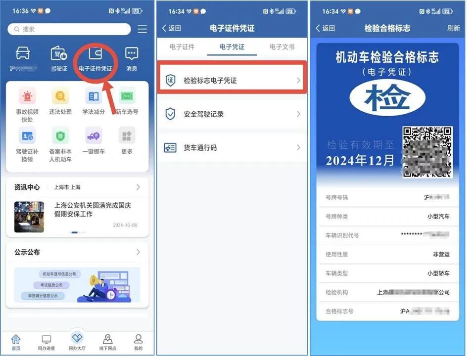 在app首页上方点击“电子证件凭证”——“检验标志电子凭证”栏目,即显示电子凭证信息。