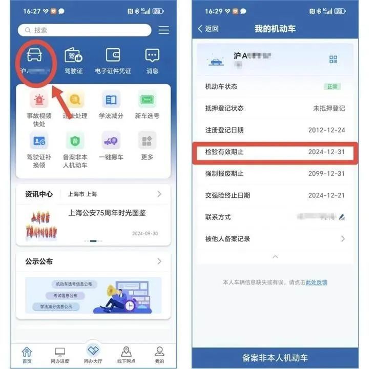 在app首页左上角点击绑定车辆,“我的机动车”中显示检验有效期信息。