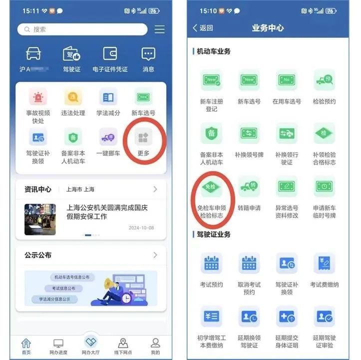 登录“交管12123”app,在“业务中心”——“机动车业务”版块选择“免检车申领检验标志”,根据页面提示操作即可申领。建议选择申领电子标志(不需要纸质凭证,电子标志与纸质凭证具有同等法律效力),系统将自动受理、审核申请信息并核发电子检验标志。