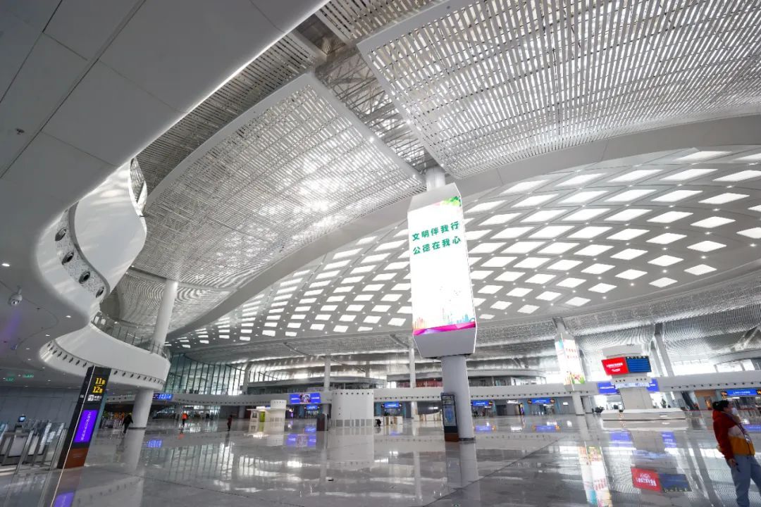 在环保层面上,候车大厅的整体设计也颇有讲究。大厅顶部的双层膜结构既保证了自然光的引入,为旅客提供舒适的日光环境,同时也兼具遮光、遮热、遮雨作用,生动诠释了科技、低碳、绿色、舒适与美观的多重协调性。